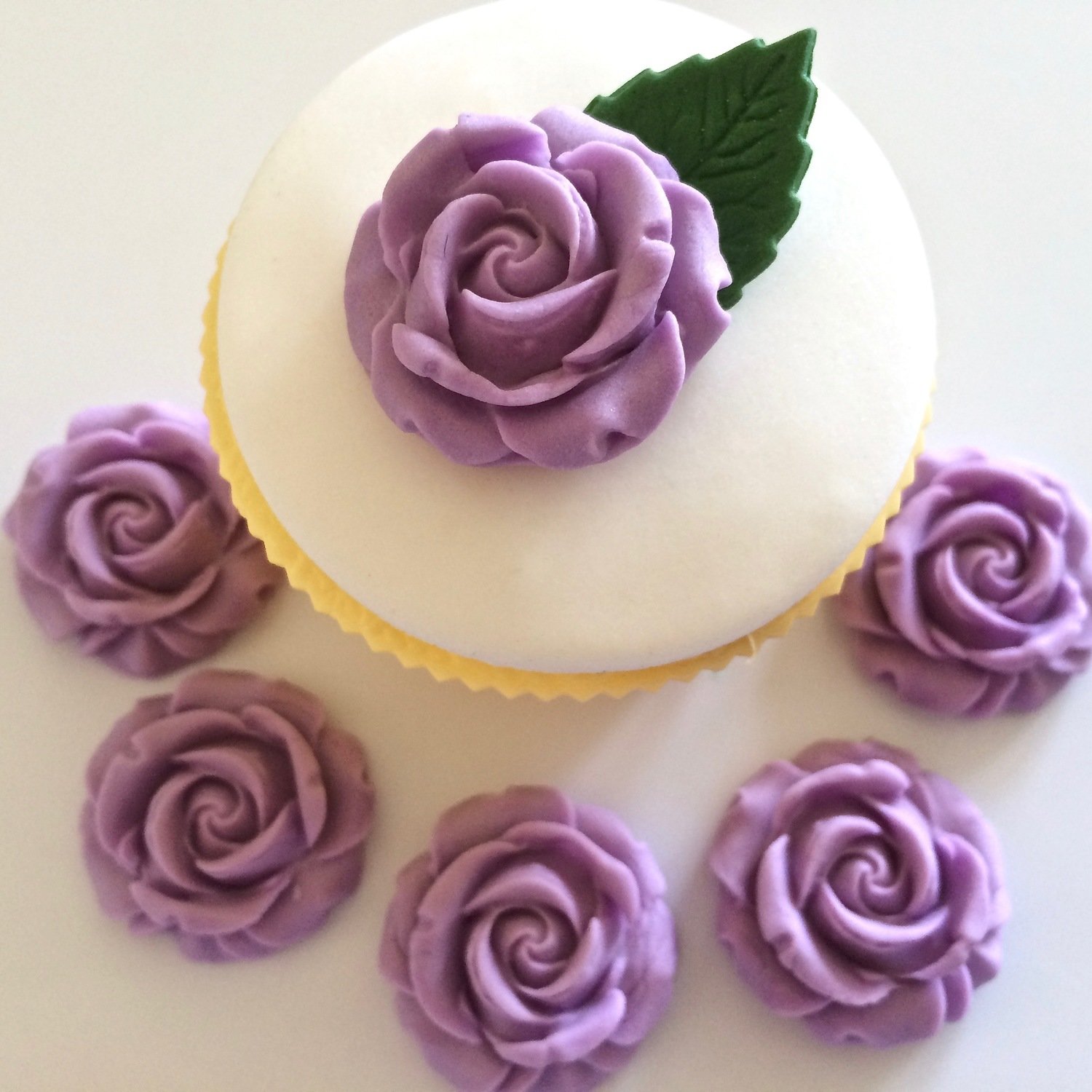 Pretty lilac sugar paste roses suitable for wedding cupcakes and also perfect for other celebration cakes. Shown here on a standard cupcake.