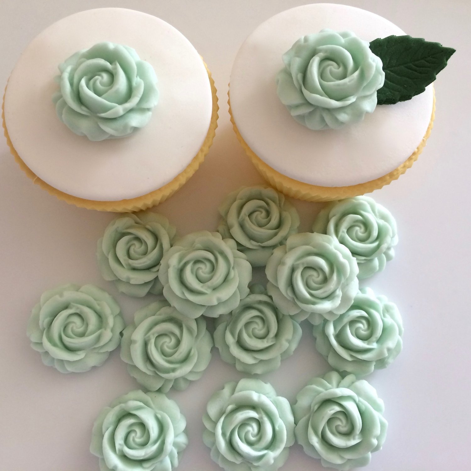 Pretty pale jade sugar paste roses suitable for wedding cupcakes and also perfect for other celebration cakes. Shown here on standard cupcakes.