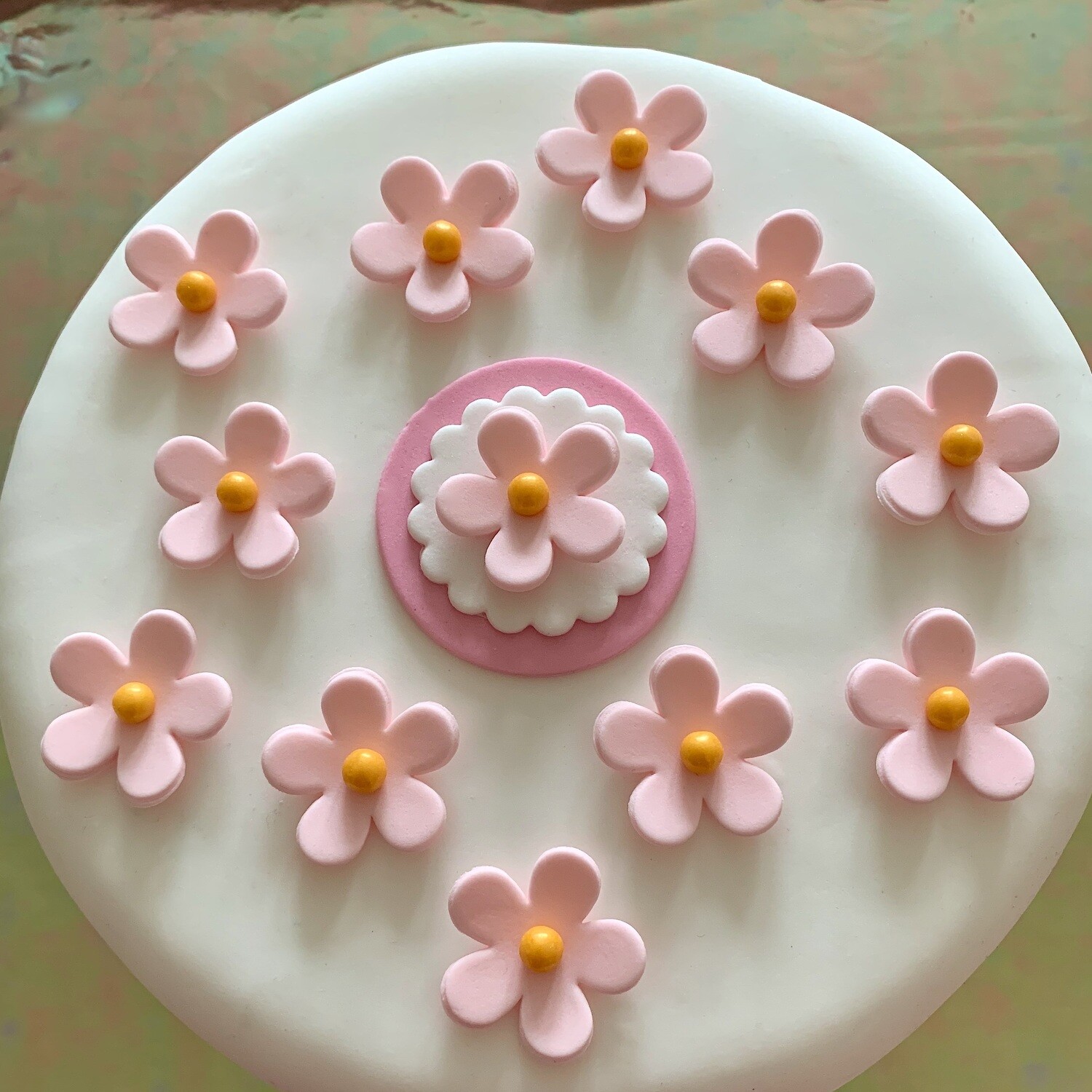 Striking bold sugar paste flowers in pink blush with golden sugar pearl centres. Pretty and easy for decorating any cakes. Shown here on a standard size cupcake and an 8" cake.