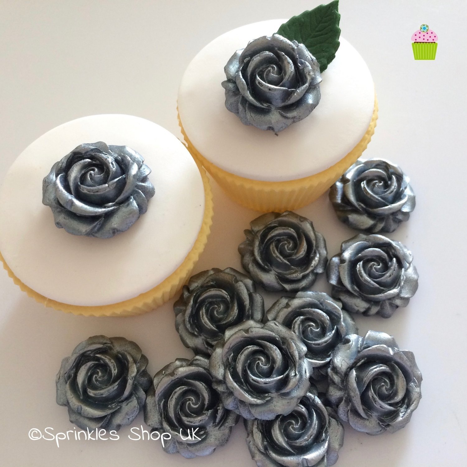 Silver sugar paste rose cake decorations, super for anniversary cakes. Shown here on standard size cakes.