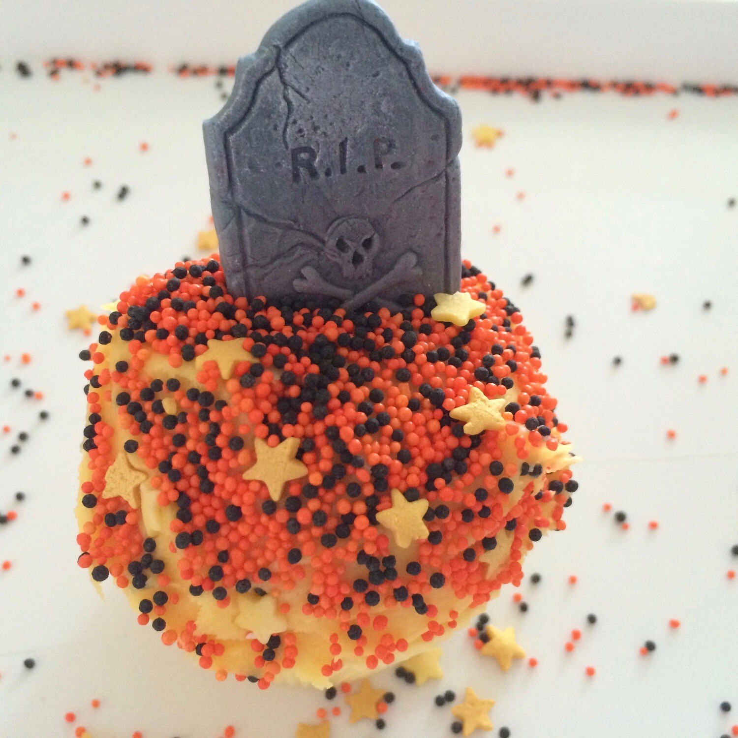 Ghoulish halloween tombstones, sugar paste cake decorations slightly frosted. Shown here on a standard size cupcake. Our Twilight Sprinkles go well with these.