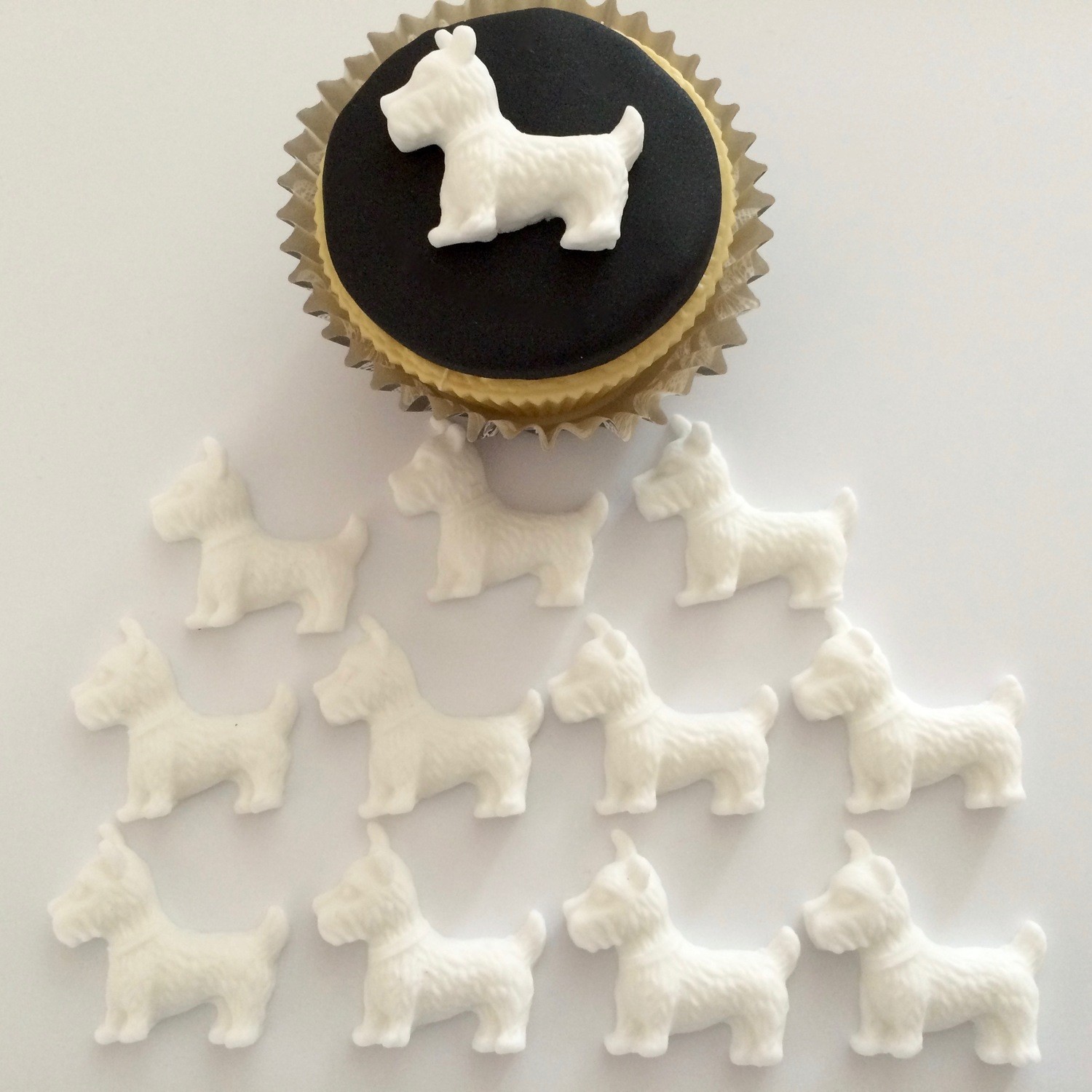 Twelve very cute little sugar paste Westie Scottie type dogs. Shown here on standard size cupcakes.
